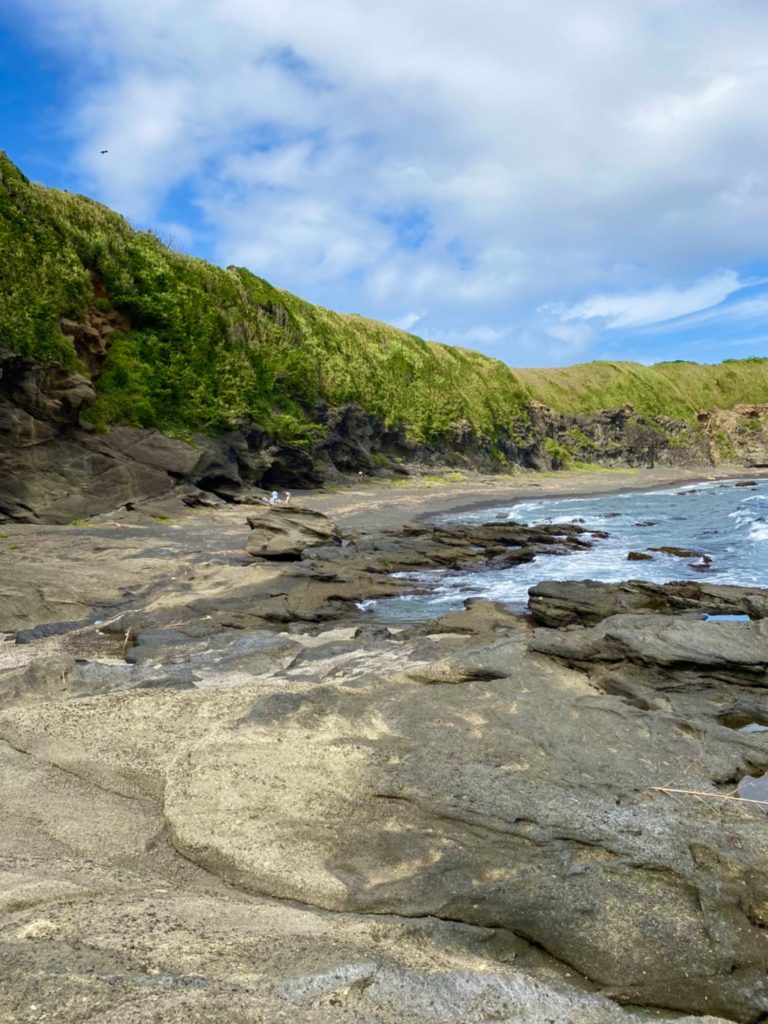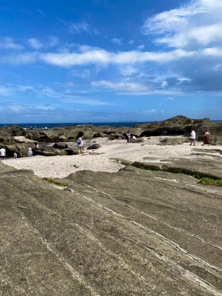 階段降りると岩場が広がっており奥が砂浜になっています。