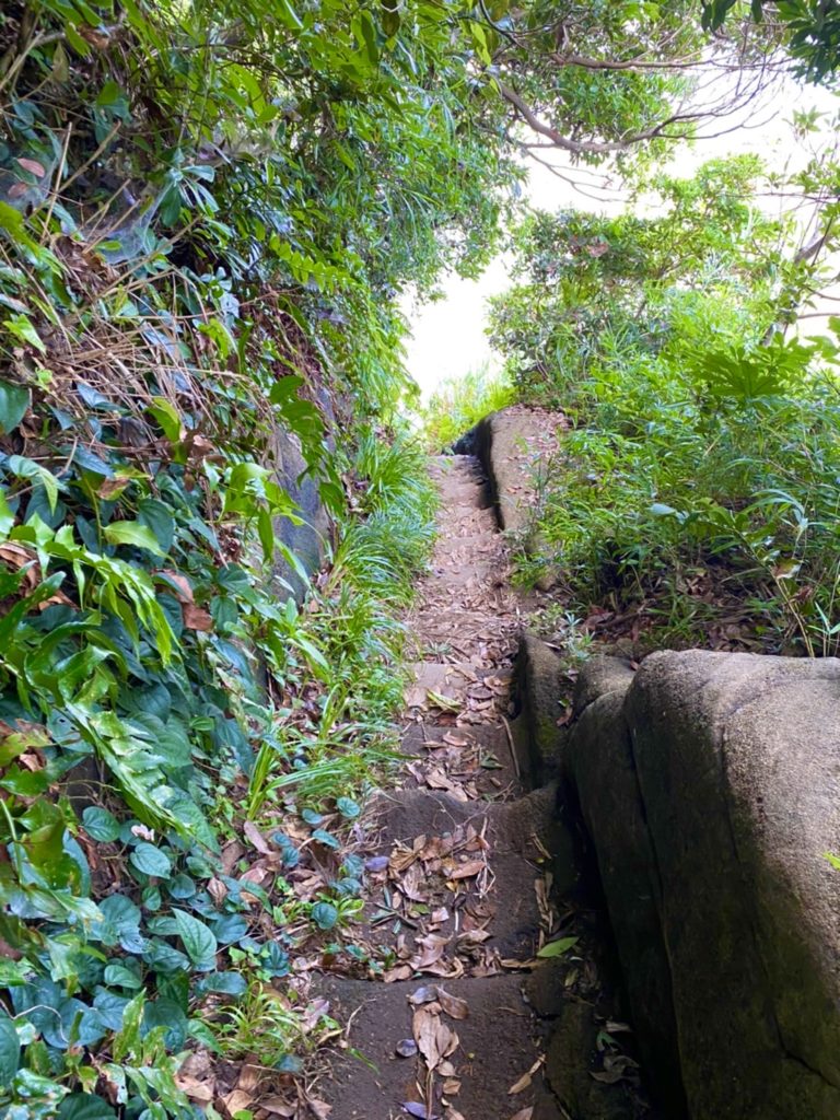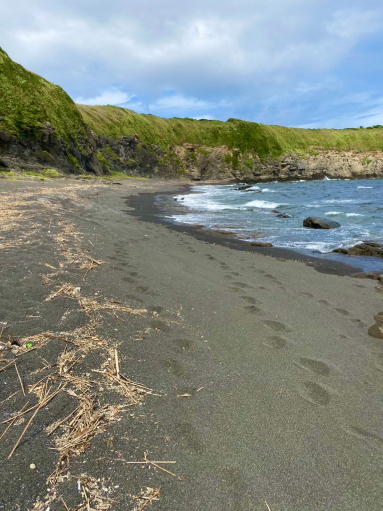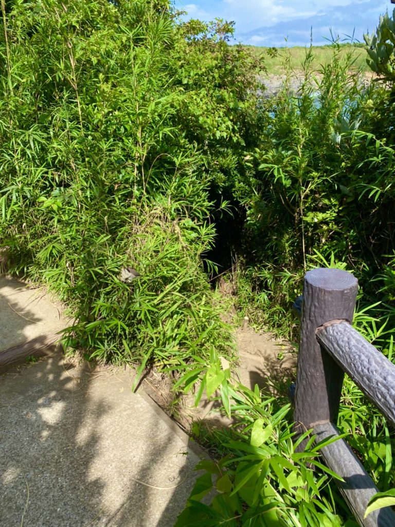 ハイキングコースに沿って馬の背洞門へ向かう途中左側に急階段があります。そこを下ると赤羽根海岸に辿り着きます。