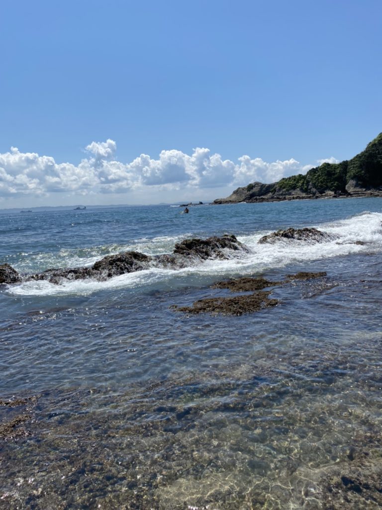 潮が引くと砂浜側にも岩場は波を打ち消しタイドプールが現れます。子供にちょうど良いかもしれません。